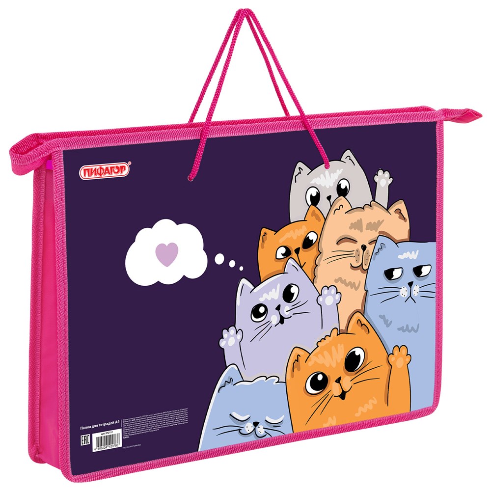 Папка на молнии с ручками ПИФАГОР А4, 1 отделение, пластик, ручки-шнурок, "Cats greetings", 272111