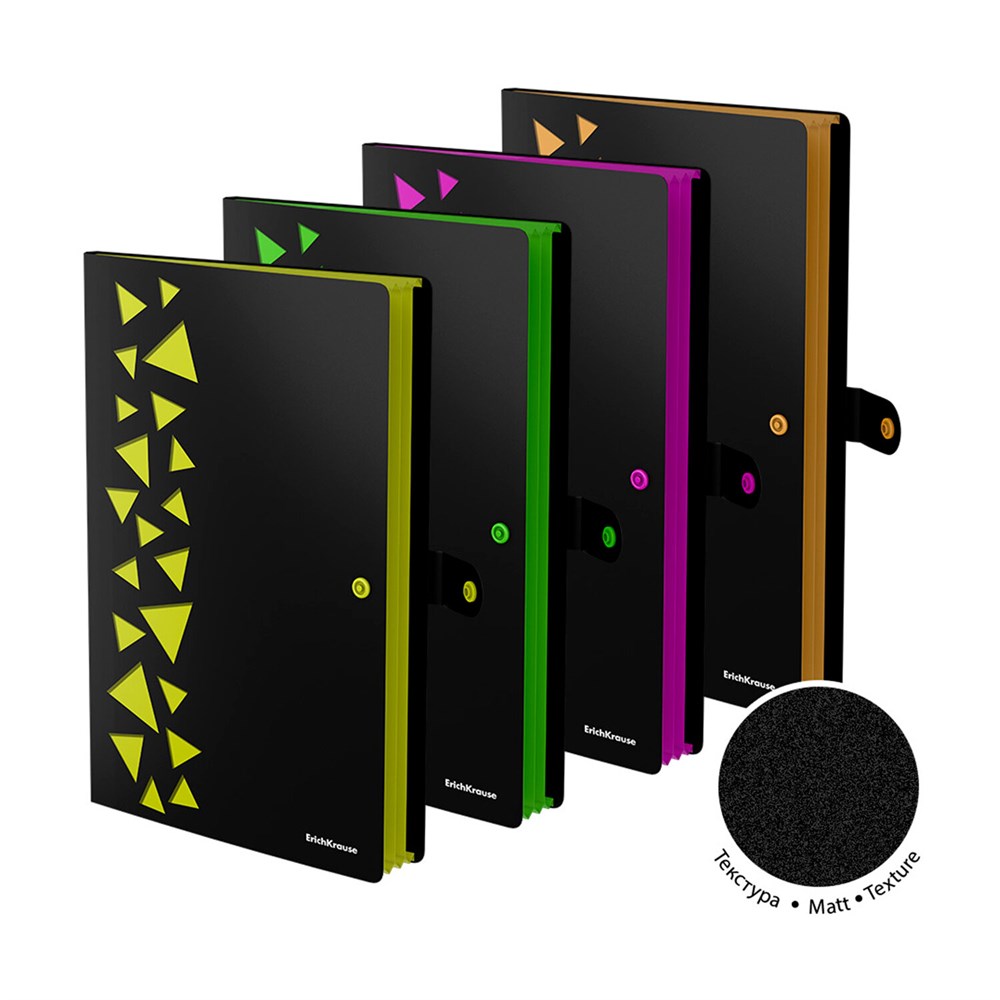 Папка-органайзер с 4 отделениями ERICH KRAUSE "Matt Accent" формата A4 из высококачественного пластика с текстурой поверхности "песок", на которой не видно отпечатков пальцев и мелких царапин.Предназначена для хранения, систематизации и транспортировки документов. Цвет папки – черный, цвет отделений – ассорти: желтый, зеленый, оранжевый, розовый. Надежная застежка-кнопка обеспечивает быстрый доступ к бумагам. Папка вмещает до 150 бумажных листов. Размер папки – 244х330х17 мм, толщина материала – 0,6 мм.