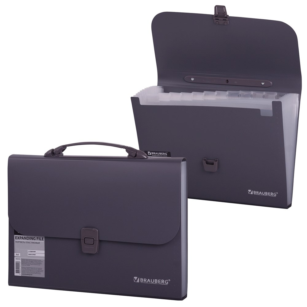 Портфель BRAUBERG предназначен для транспортировки документов, бумаг и различных предметов и широко используется школьниками, студентами, офисными работниками и людьми творческих профессий.Портфель формата А4 (327х254х30 мм) изготовлен из плотного пластика стандартной фактуры толщиной 0,7 мм, выполнен в солидном темно-сером цвете и имеет 13 отделений с индексными ярлыками. Складная ручка обеспечивает компактность изделия. Портфель застегивается на клапан.