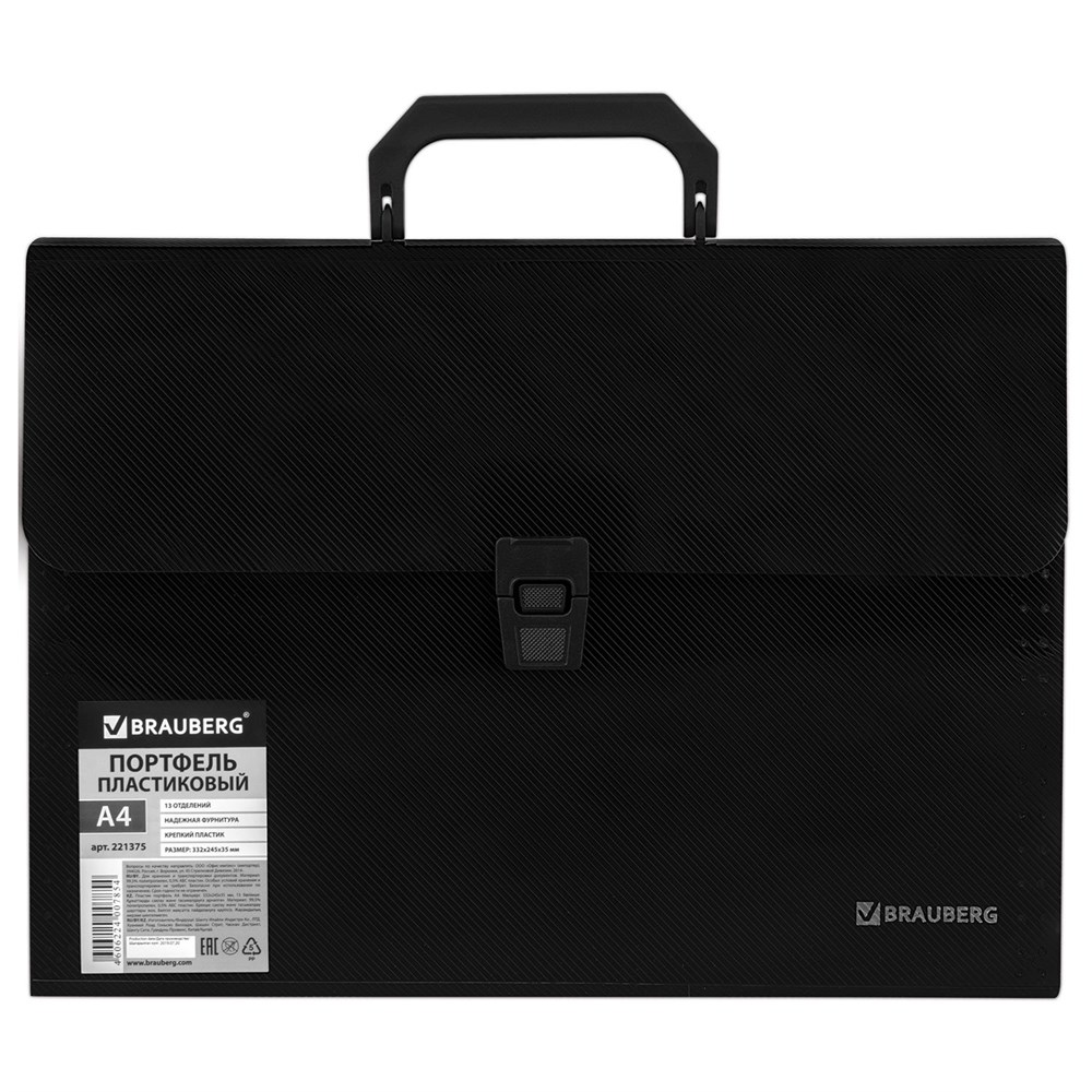 Папка-портфель пластиковая BRAUBERG А4 (332х245х35 мм), 13 отделений, фактура диагональ, черная, 221375