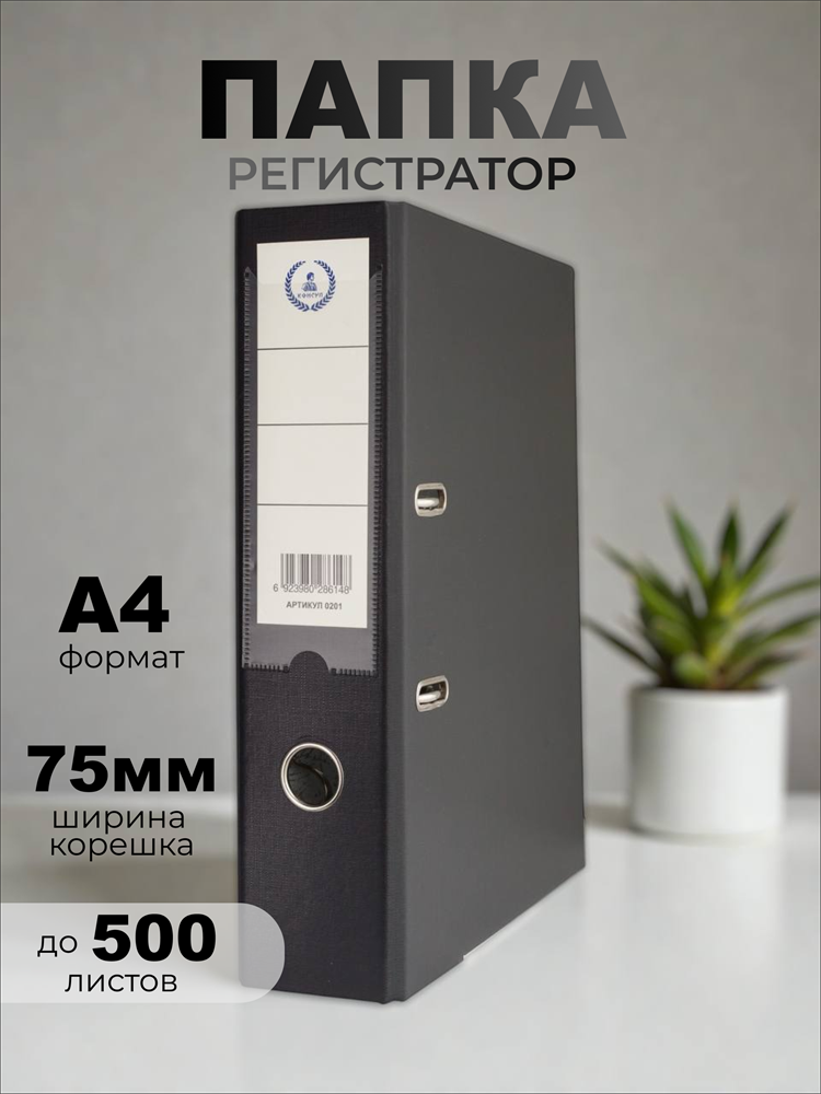 Папка-регистратор Консул ПВХ, 75 мм, металлический уголок, кармашек со сменной этикеткой. Цвет: черный