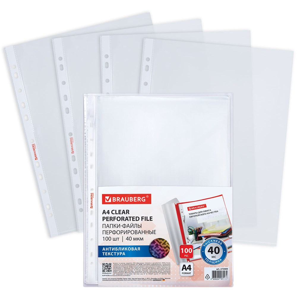 Перфорированные папки-файлы BRAUBERG предназначены для хранения и защиты бумажных документов от загрязнения и механических повреждений.Перфопапки формата А4 с вертикальным размещением и универсальной перфорацией имеют антибликовую поверхность и прочные швы. Файлы являются незаменимым атрибутом в офисе, позволяют систематизировать документы и обеспечивают их сохранность на долгое время. Изготовлены из прочной пленки толщиной 40 мкм. В комплект входит 100 перфопапок.