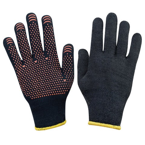 Перчатки хлопок + полиэфир УТЕПЛЕННЫЕ МАХРА, 1 пара, 10 класс, 77-80 г, размер 9, ПВХ ТОЧКА, утепленные с начесом внутри, СВС, 7.723 чер/оранж
