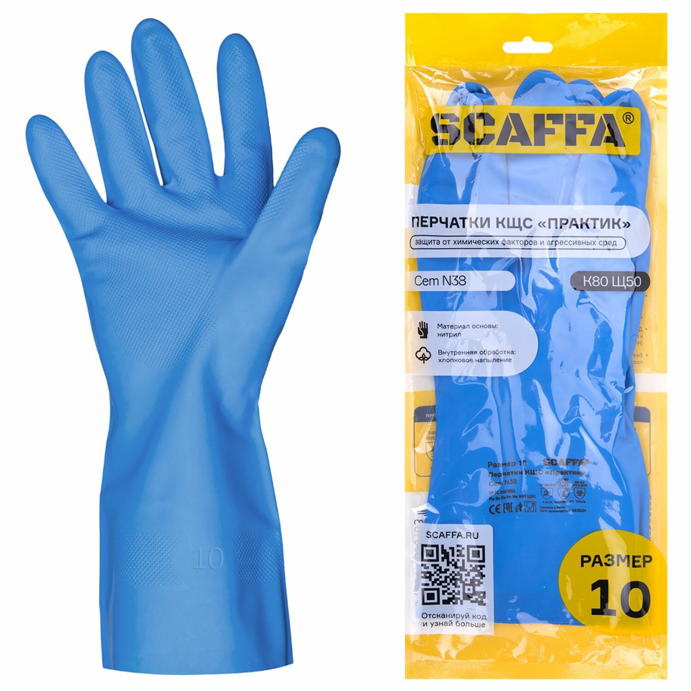 Перчатки нитриловые SCAFFA "Практик", хлопчатобумажное напыление, КЩС-1, размер 10, XL (очень большой), синие, 00-01017723
