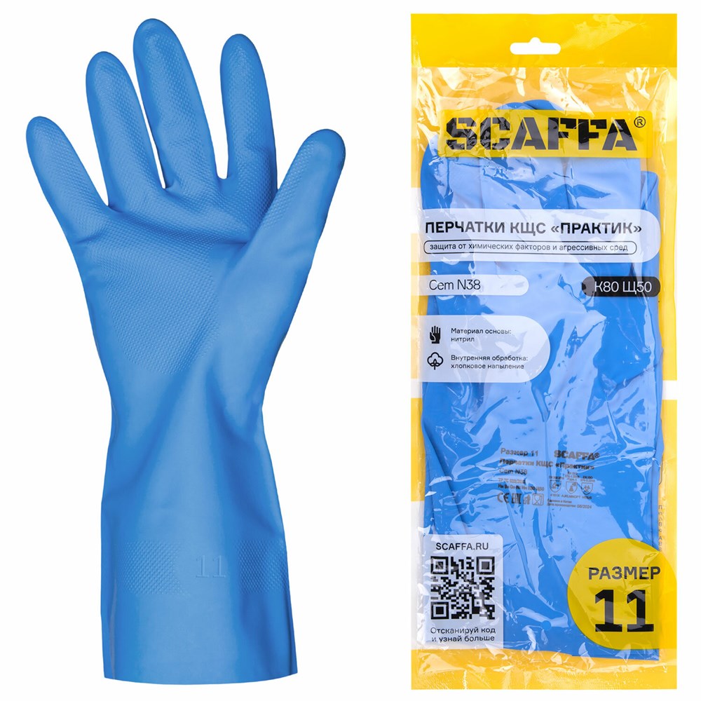 Перчатки нитриловые SCAFFA "Практик", хлопчатобумажное напыление, КЩС-1, размер 11, XXL (экстра большой), синие, 00-01017724