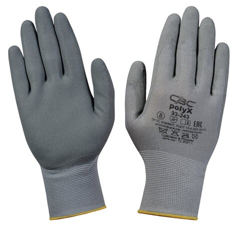 Перчатки полиэфирные ПОЛИКС маслостойкие 1 пара, 15 класс, 30-32 г, размер 9, покрытие - облив ПОЛИУРЕТАНОВОЕ, эластичные и комфортные, СВС, 93-243 сер/сер