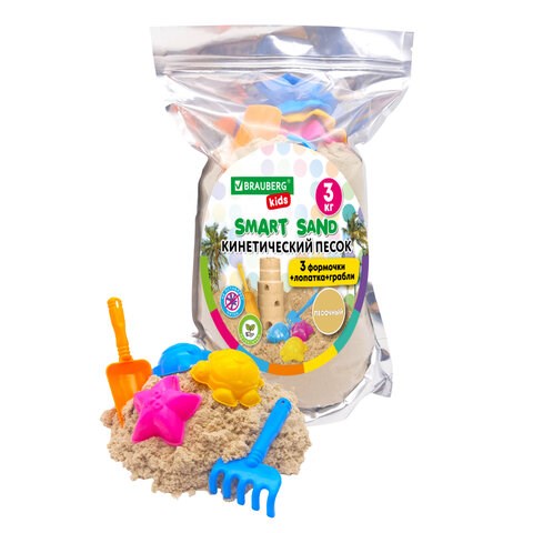 Песок для лепки кинетический, цвет песочный, 3000г, 3 формочки, лопатка, грабли, BRAUBERG KIDS, 666004