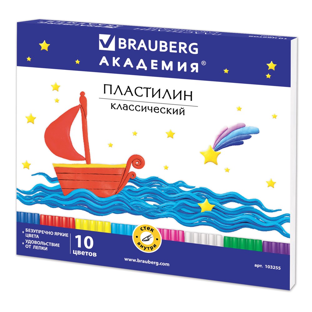 Пластилин классический BRAUBERG "АКАДЕМИЯ", 10 цветов, 200 г, со стеком, картонная упаковка, 103255