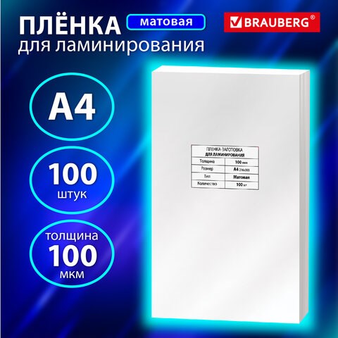 Пленки-заготовки для ламинирования А4, КОМПЛЕКТ 100 шт., 100 мкм, МАТОВАЯ, BRAUBERG, 531780