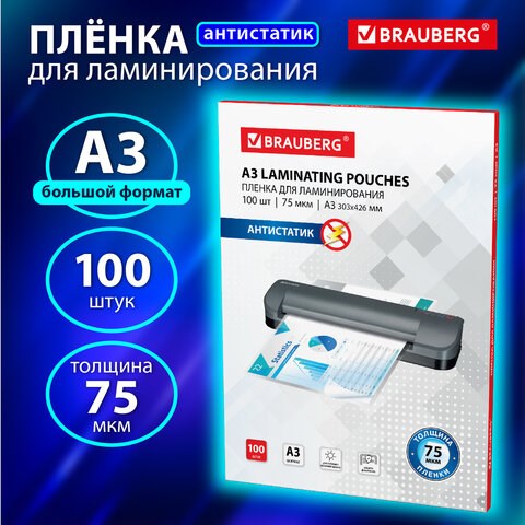 Пленки-заготовки для ламинирования АНТИСТАТИК БОЛЬШОГО ФОРМАТА А3, КОМПЛЕКТ 100 шт., 75 мкм, BRAUBERG, 531796