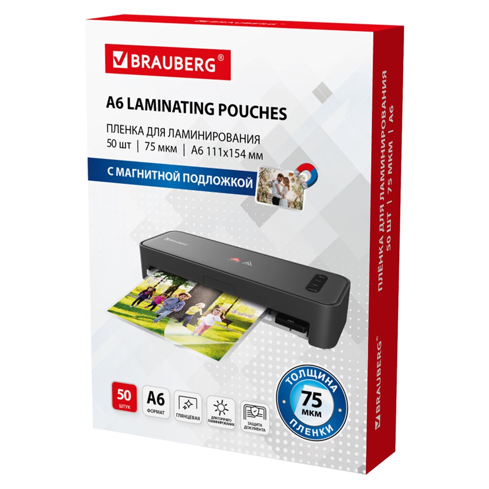Магнитная пленка для ламинирования BRAUBERG надежно защитит документы от влаги, пыли, воздействия УФ-лучей и других внешних факторов. После ламинирования плёнку можно разместить на холодильнике или другой подходящей поверхности.Представляет собой двойной пакет, спаянный с одной стороны (содержание полиэстера > 50%). Документ вкладывается между слоями пленки и в дальнейшем подвергается термообработке в ламинаторе. Суммарная толщина пленки-заготовки – 150 (75х2) мкм, что позволяет защитить документы и увеличить жесткость, сохраняя яркость изображения.