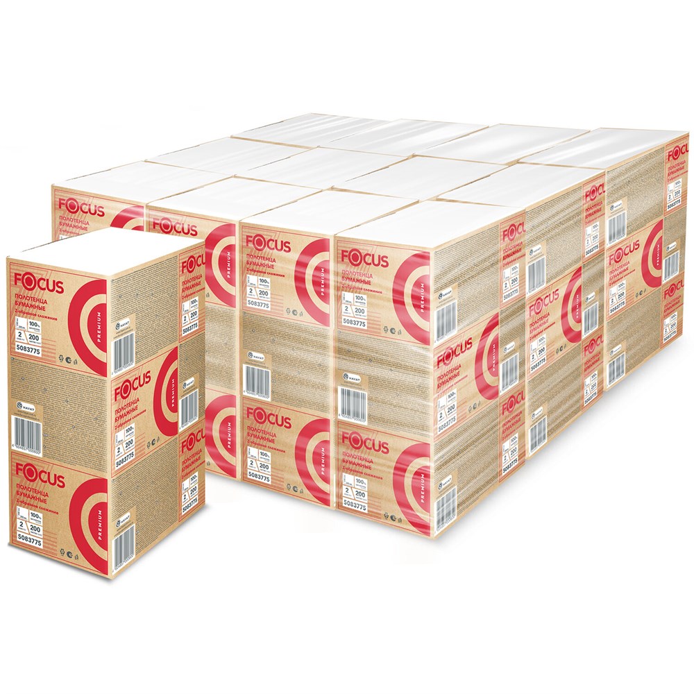 Полотенца бумажные 200 шт., FOCUS (Система H2) Premium, 2-слойные белые, КОМПЛЕКТ 12 пачек, 24х20 см, Z-сложение, 5083775