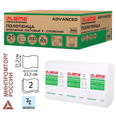 Полотенца бумажные 200 шт., LAIMA (H2) ADVANCED, 2-слойные, белые, КОМПЛЕКТ 21 пачка, 24х21,6, Z-сло