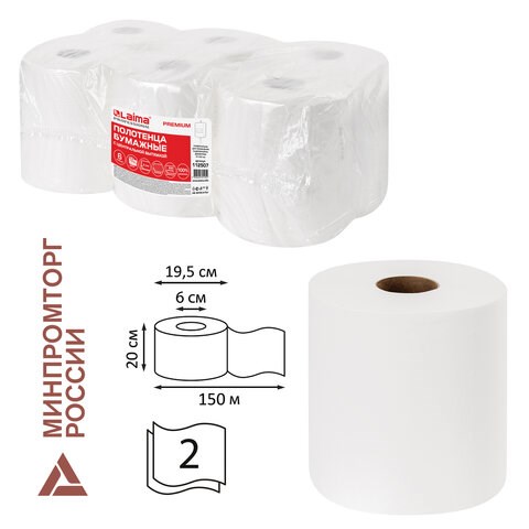 Полотенца бумажные с центральной вытяжкой 150 м, LAIMA (Система M2) PREMIUM, 2-слойные, белые, КОМПЛЕКТ 6 рулонов, 112507