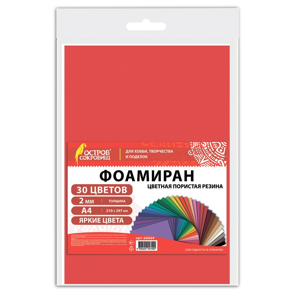 Пористая резина/фоамиран А4, 2 мм, НАБОР, 30 листов, 30 цветов, яркие цвета, ОСТРОВ СОКРОВИЩ, 665664