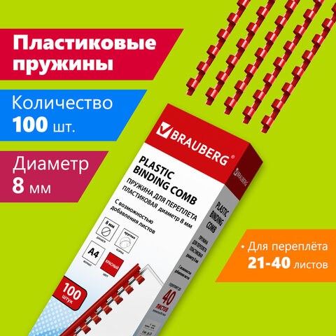 Пружины пластиковые для переплета, КОМПЛЕКТ 100 шт., 8 мм (для сшивания 21-40 л.), красные, BRAUBERG, 530908