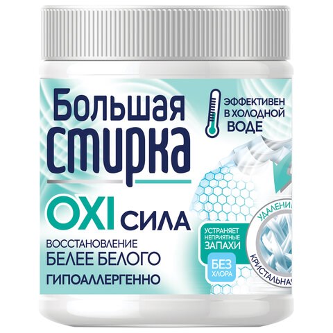 )Кислородный пятновыводитель-отбеливатель БОЛЬШАЯ СТИРКА эффективно удаляет пятна и и неприятные запахи. Обладает антимикробным действием. Придает вещам кристальную белизну. Безопасен для всех типов тканей. Эффективны даже в холодной воде. Гипоалергенный.