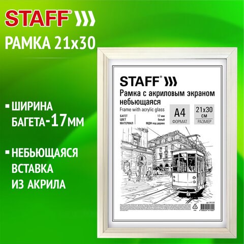 Рамка 21х30 см небьющаяся, багет 17 мм МДФ под дерево, STAFF "Carven", белая, 391320