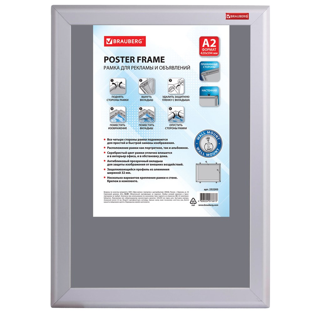 Рамка настенная для рекламы БОЛЬШОГО ФОРМАТА (420х594 мм), алюминиевая, прижимные стороны, BRAUBERG, 232205