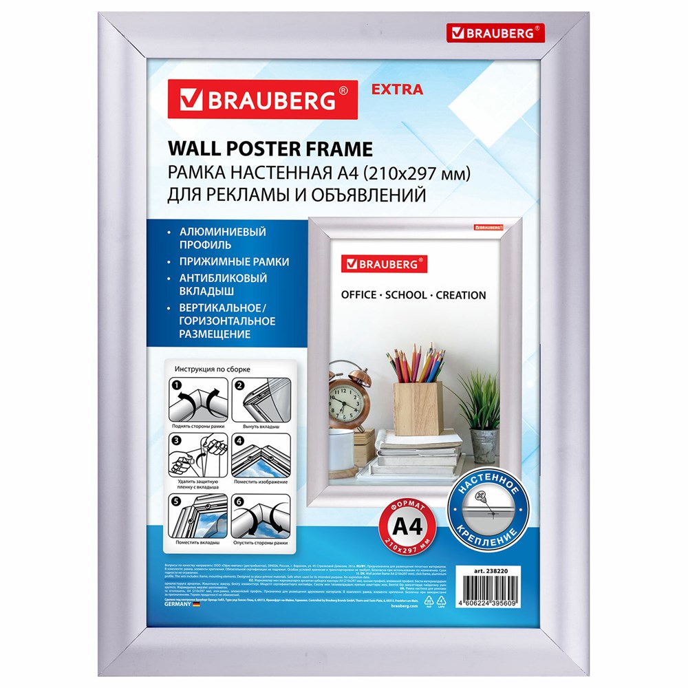 Рамка настенная с защелкивающимся профилем BRAUBERG "Extra" предназначена для размещения печатных материалов. Идеально подходит для использования в офисе, торговых залах, пунктах выдачи, медицинских и других учреждениях.Профиль рамки изготовлен из анодированного алюминия. Изменяемое расположение – книжное или альбомное. Благодаря прозрачному антибликовому покрытию документы отчётливо видны посетителю, не мнутся и не загрязняются в течение всего эксплуатационного периода. Рамка крепится к стене через специальные отверстия при помощи дюбелей и саморезов. Элементы крепления входят в комплект. Максимальная высота вставляемого листа – 297 мм, максимальная ширина вставляемого листа – 210 мм. Цвет рамки - матовое серебро. Ширина багета – 2,5 см.