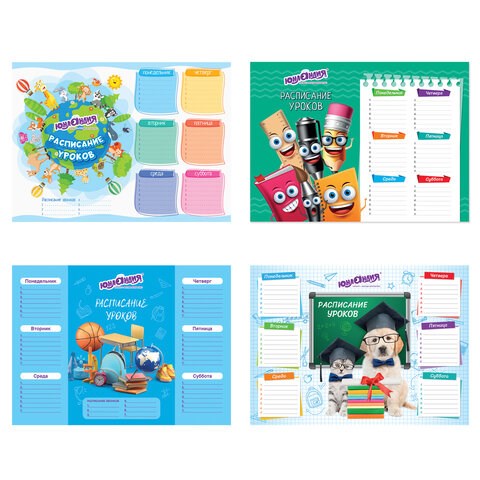 Расписание уроков ЮНЛАНДИЯ разработано специально для детей школьного возраста. Оно идеально подходит для планирования и подготовки заданий в домашних условиях. Поставляется в четырех вариантах дизайна (без возможности выбора).