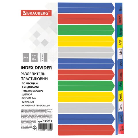 Разделитель пластиковый BRAUBERG А4+, 12 листов, Январь-Декабрь, оглавление, Цветной, РОССИЯ