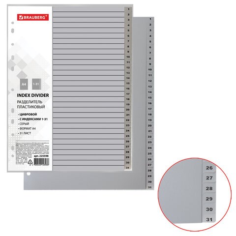Разделитель пластиковый BRAUBERG А4, 31 лист, цифровой 1-31, оглавление, Серый, РОССИЯ