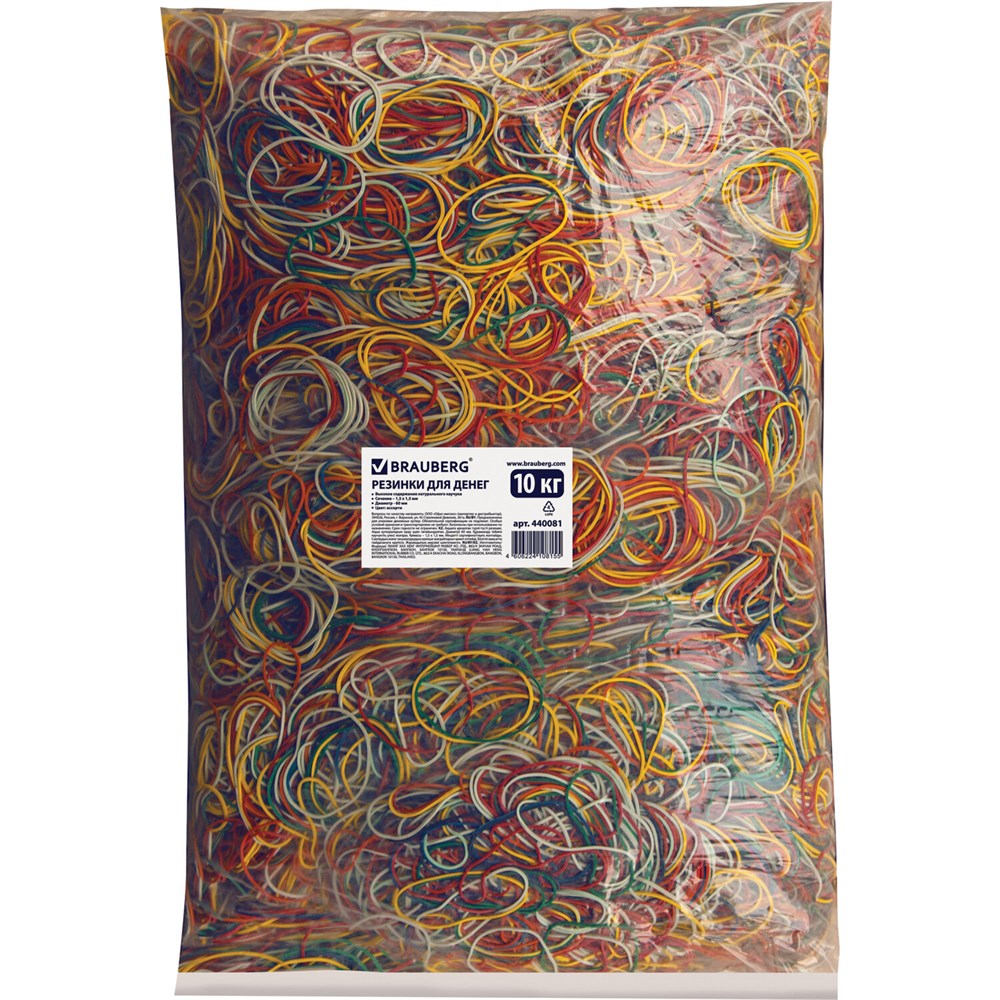 Банковские резинки BRAUBERG незаменимы во многих сферах жизни – они активно используются в банковском деле, бухгалтерии, офисах, рукоделии и быту. предназначены для фасовки и упаковки денежных купюр.Благодаря натуральному каучуку они могут свободно растягиваться в несколько раз и мгновенно возвращаются к своему первоначальному диаметру, равному 60 мм. Толщина в 1,5 мм гарантирует прочность изделия. Вес - 10000 г, количества в упаковке около 15000 штук хватит на максимально продолжительное время. Цвет - ассорти.