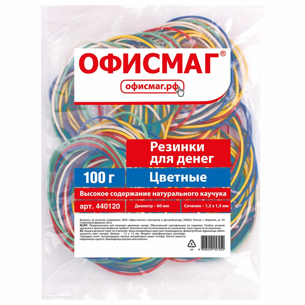 Резинки банковские универсальные диаметром 60 мм, ОФИСМАГ 100 г, цветные, натуральный каучук, 440120