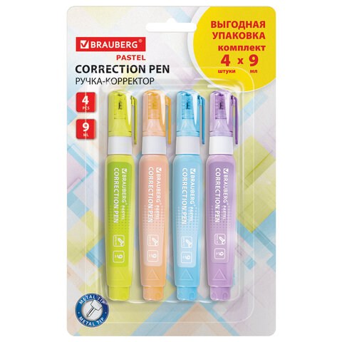 Ручка-корректор 9 мл ВЫГОДНАЯ УПАКОВКА, КОМПЛЕКТ 4 штуки, BRAUBERG PASTEL, 271922