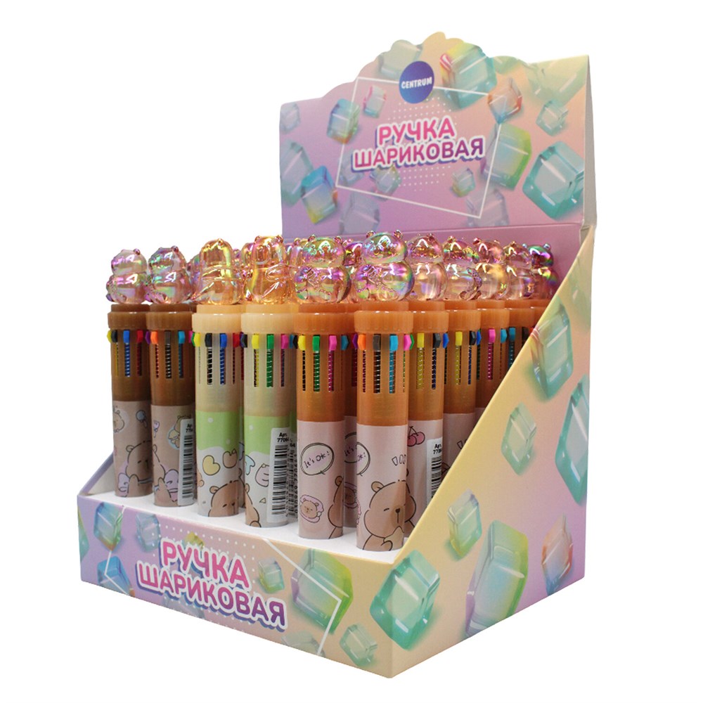 Ручка многоцветная с топпером шариковая 10 ЦВЕТОВ "Капибара". Модель удобна в использовании, экономит место в пенале или на рабочем столе, позволяет всегда иметь под рукой набор основных цветов для письма и выделения записей.Ручка содержит 10 цветов (черный, коричневый, синий, красный, оранжевый, желтый, зеленый, голубой, розовый, фиолетовый) с оптимальной толщиной пишущего узла 0,7 мм. Автоматический нажимной механизм обеспечивает плавную подачу необходимого стержня. Разноцветные чернила оптимальной консистенции равномерно распределяются при письме, мгновенно высыхая и не размазываясь. Металлический наконечник не деформирует бумагу, обеспечивает плавное и мягкое скольжение, оставляя ровные и четкие линии. Пластиковый круглый корпус дополнен резиновой фигуркой, не утяжеляющей ручку.