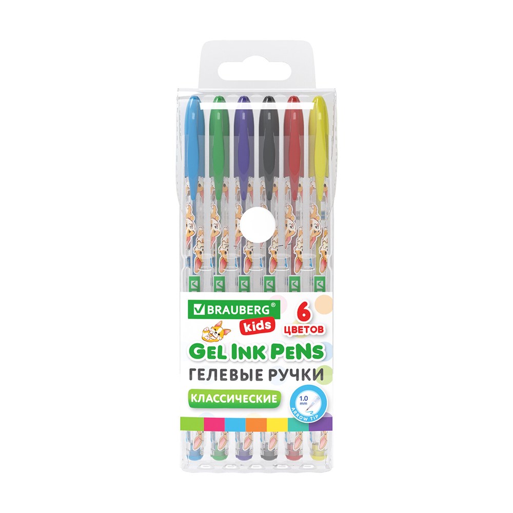Ручки гелевые КЛАССИЧЕСКИЕ BRAUBERG KIDS "CUTE ANIMALS", НАБОР 6 ЦВЕТОВ, корпус с печатью, узел 1 мм, линия письма 0,7 мм, 144441