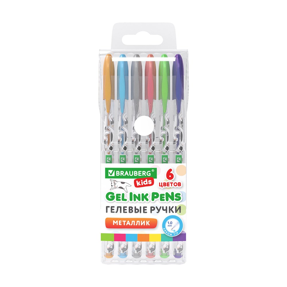 Ручки гелевые МЕТАЛЛИК BRAUBERG KIDS "CUTE ANIMALS", НАБОР 6 ЦВЕТОВ, корпус с печатью, узел 1 мм, линия письма 0,7 мм, 144440