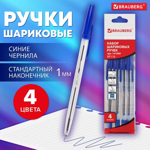 Ручки шариковые BRAUBERG, НАБОР 4 шт., СИНИЕ, "Line", узел 1 мм, линия письма 0,5 мм, 141099