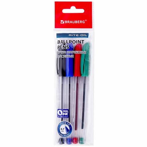Ручки шариковые масляные BRAUBERG, НАБОР 4 шт., АССОРТИ, "Rite-Oil", узел 0,7 мм, линия письма 0,35 мм, 142150