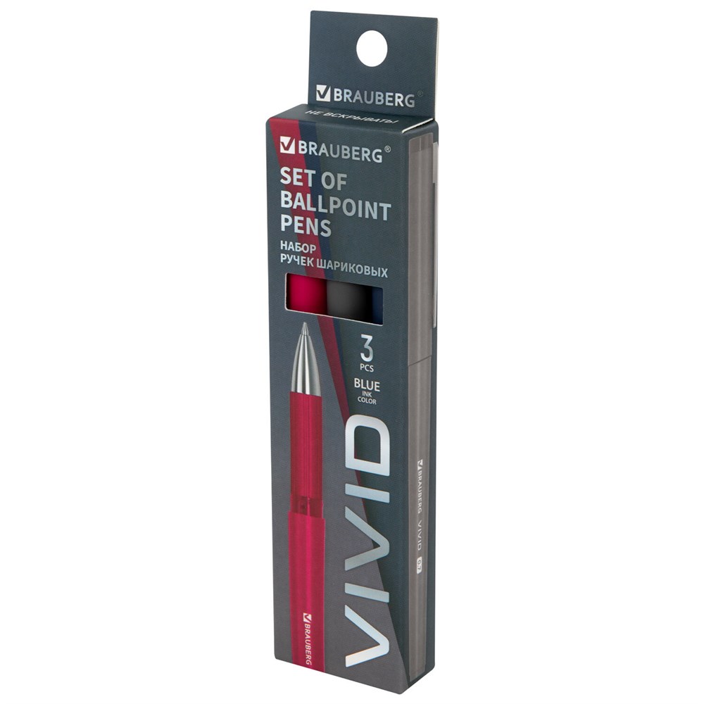 Ручка шариковая BRAUBERG "VIVID" – универсальный инструмент для ведения различных заметок и записей в школе, университете и офисе.Набор включает в себя 3 шариковые ручки в стильных темных оттенках: синий, графитовый и бордовый. Мягкое покрытие корпуса SOFT TOUCH и прорезиненный грип в области захвата придают особый комфорт при письме. Стандартный наконечник диаметром 0,7 мм создает линию письма 0,35 мм. Цвет чернил – синий, что идеально подходит для создания записей как для учебы, так и для работы.