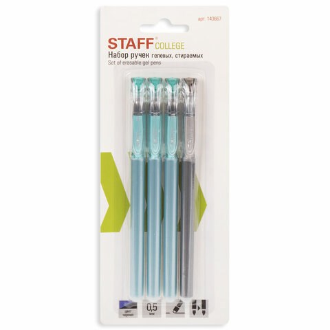 Ручки стираемые гелевые STAFF "College" EGP-664, НАБОР 4 штуки (3 СИНИХ, 1 ЧЕРНАЯ), игольчатый узел 0,5 мм, линия письма 0,38 мм, 143667