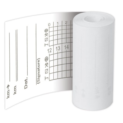 )Предназначены для печати данных о режиме труда и отдыха водителя. На обратной стороне ленты нанесена сетка с метками времени и пиктограммами для записи данных вручную (в случае выхода тахографа из строя). Подходят для всех типов цифровых тахографов.