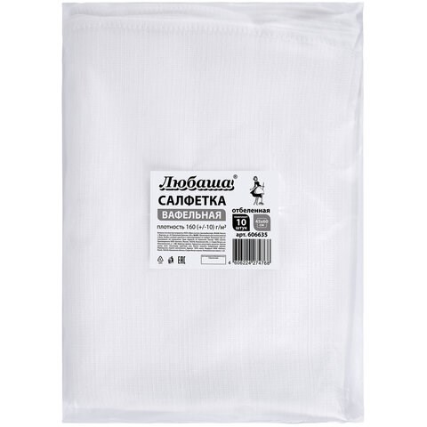 Салфетка ВАФЕЛЬНАЯ отбеленная, 45х60 см, плотность 160(±10) г/м2, КОМПЛЕКТ 10 шт., ЛЮБАША, 606635