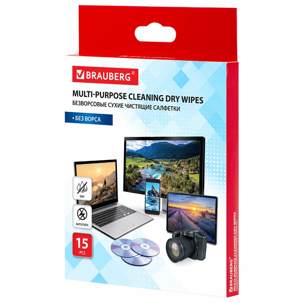 Салфетки сухие безворсовые УНИВЕРСАЛЬНЫЕ антистатичные BRAUBERG, 15 шт., 513534