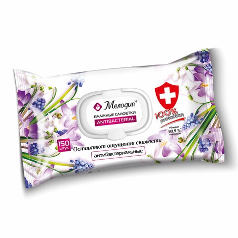 Салфетки влажные 150 шт., АНТИБАКТЕРИАЛЬНЫЕ, с пластиковым клапаном, МЕЛОДИЯ, 115226