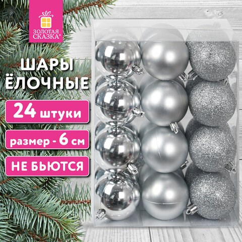 Шары ёлочные 24 шт., 6 см, "Trio", пластик, СЕРЕБРИСТЫЕ (глянец, матовый, глиттер), ЗОЛОТАЯ СКАЗКА, 592161