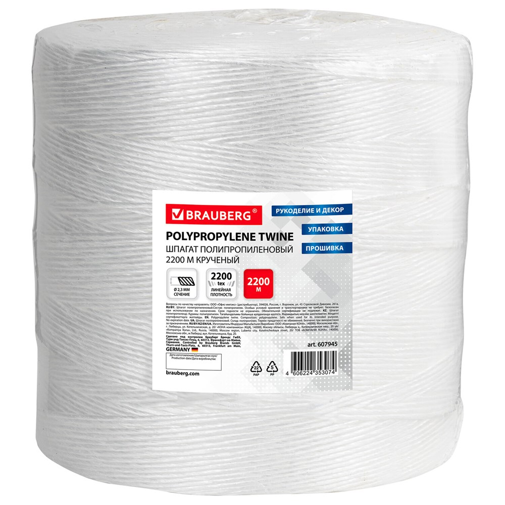 Полипропиленовый шпагат BRAUBERG отлично подходит для упаковки товаров и посылок, прошивки документов, подвязки растений и деревьев, рукоделия.Изготовлен из первичного полипропиленового волокна методом скручивания нескольких волокон. Полипропиленовый шпагат легко вяжется в узлы, устойчив к истиранию, разрывам и растяжениям, обладает влагостойкостью, не подвержен гниению и поражению плесенью. В делопроизводстве шпагат активно используется для обвязки и прошивки документов, в быту - для упаковки товаров, подвязки растений и деревьев. Также полипропиленовый шпагат широко применяется в рукоделии для вязания сумок, салфеток, корзинок, ковриков и изготовления прочих декоративных изделий. Длина шпагата - 2200 м, диаметр нити - 2,3 мм, линейная плотность 2200 текс. Каждая бобина упакована в термоусадочную пленку.