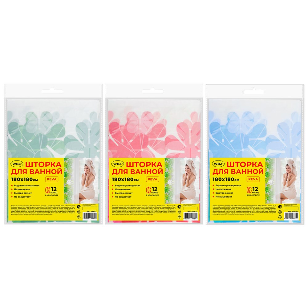 Шторка для ванной PEVA, 180х180 см, кольца в комплекте, 3 дизайна ассорти, ЦВЕТЫ, WBZ (ВБЗ), 700071