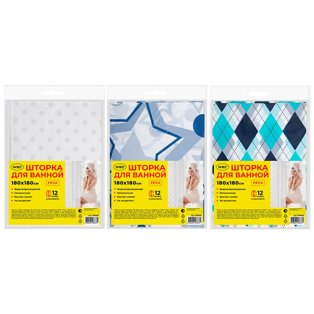 Шторка для ванной PEVA, 180х180 см, кольца в комплекте, 3 дизайна ассорти, УЗОРЫ, WBZ (ВБЗ), 700068