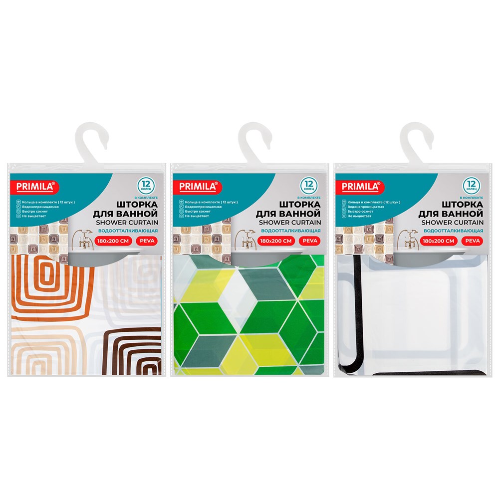 Шторка для ванной PEVA, 180х200 см, кольца в комплекте, 3 дизайна ассорти, ФИГУРЫ, PRIMILA (ПРИМИЛА), 700075