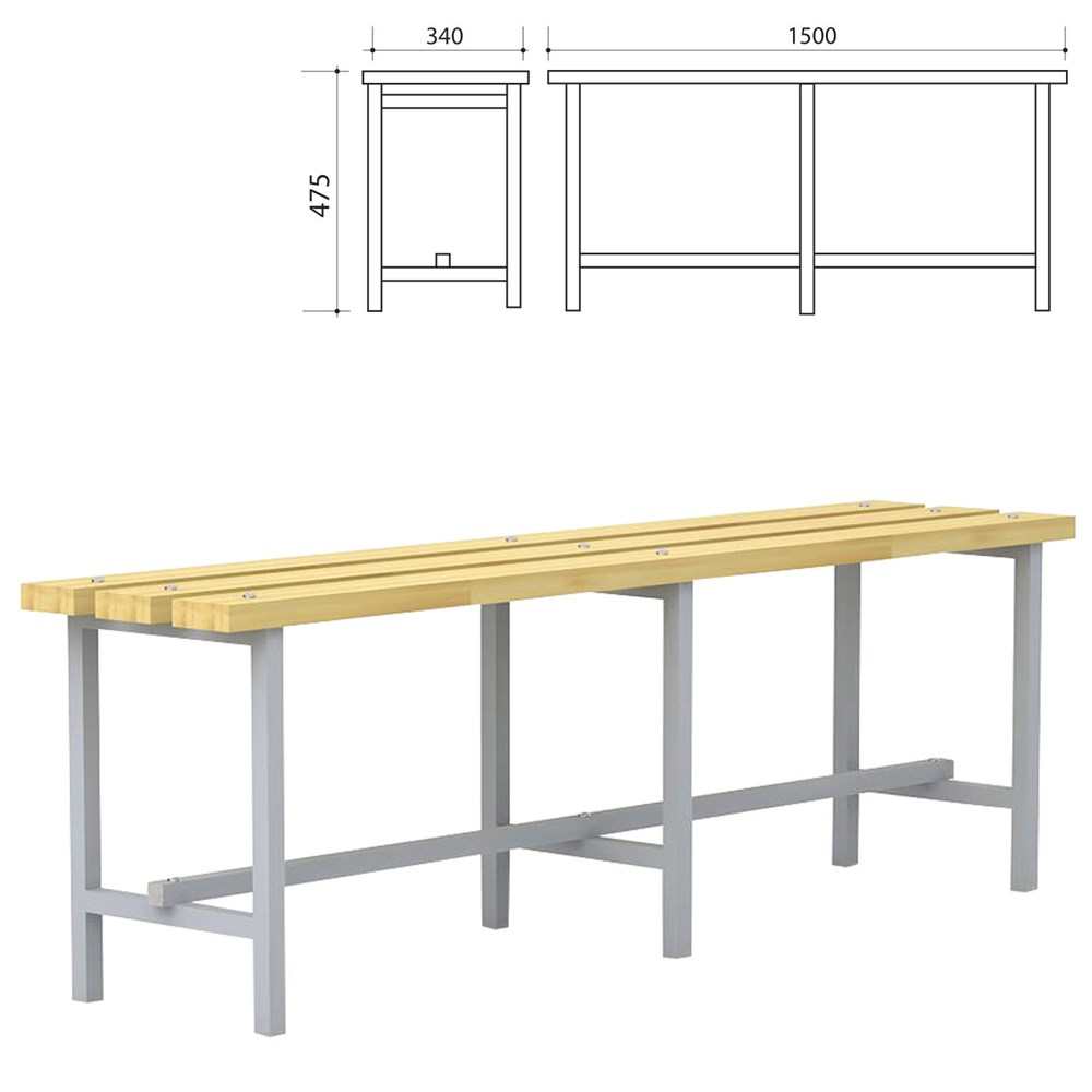 Скамья предназначена для эксплуатации в раздевалках спортивных учреждений, предприятий, офисов и т.д. Металлический каркас и доски из натуральной древесины обеспечивают надежность и долговечность конструкции. Простая сборка.Каркас из металлической трубы серого цвета прямоугольного сечения размером 25х25 мм. Покрытие - полимерное, порошковое. Сиденье - доска из сосны толщиной 30 мм, покрыто прозрачным лаком с антисептиком. Размеры (ШхГхВ) - 1500х340х475 мм. Фурнитура и инструкция по сборке - в комплекте.