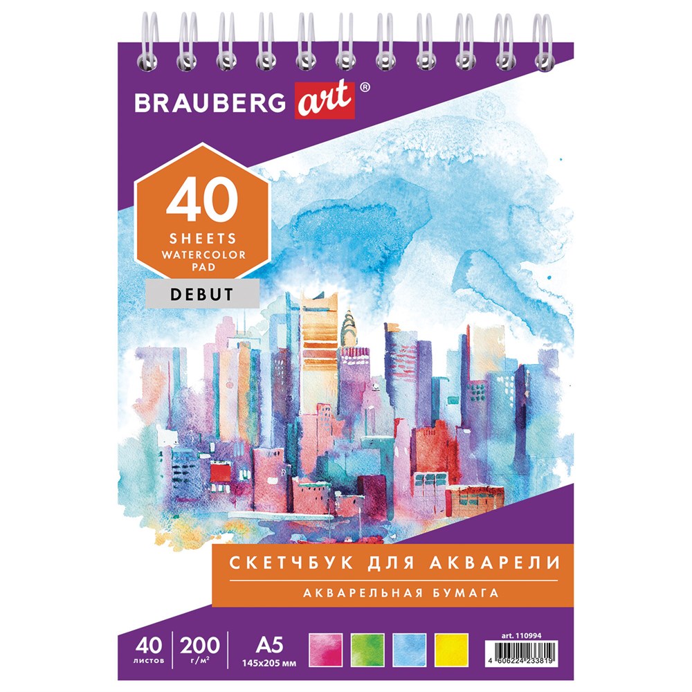 Скетчбук, акварельная белая бумага 200 г/м ГОЗНАК, 145х205 мм, 40 л., гребень, подложка, BRAUBERG ART DEBUT, 110994