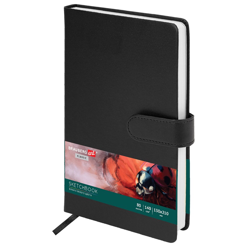 Скетчбук, белая бумага 140 г/м2 130х210 мм, 80 л., КОЖЗАМ, застежка, BRAUBERG ART CLASSIC, черный, 116461