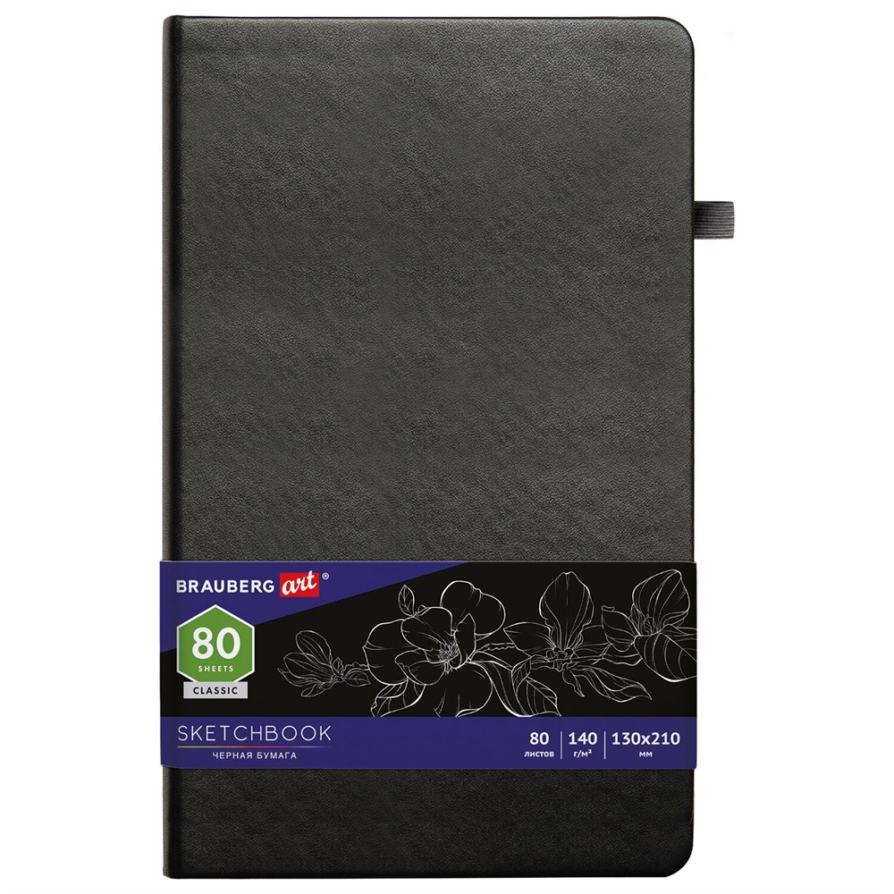 Скетчбук, черная бумага 140 г/м2, 130х210 мм, 80 л., КОЖЗАМ, резинка, карман, BRAUBERG ART CLASSIC, черный, 113203